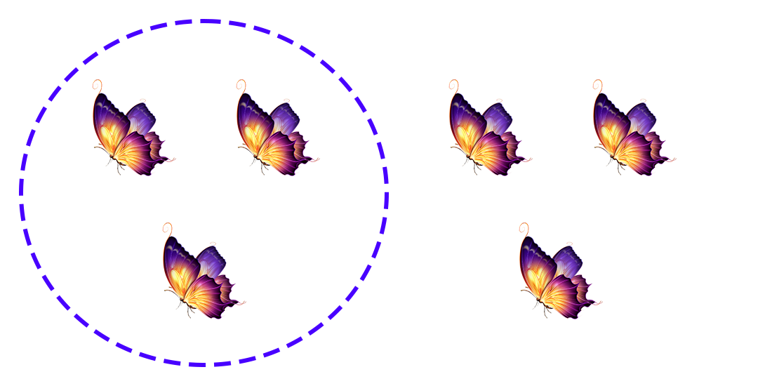 There are 3 butterflies inside the circle, and 3 more are outside the circle. Count the butterflies inside and outside, then add them together.