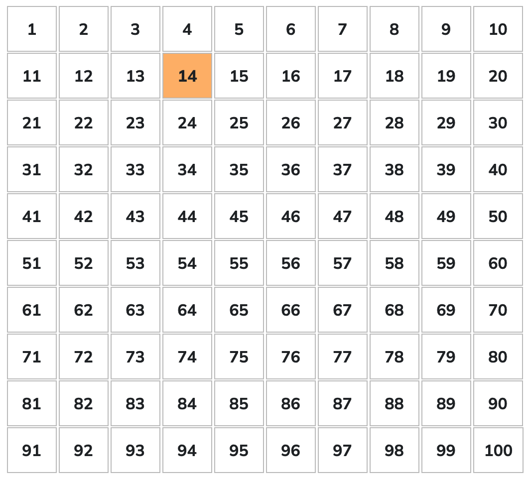 Start at 14. You move 3 rows down and one column right. What is the addition sentence and sum?