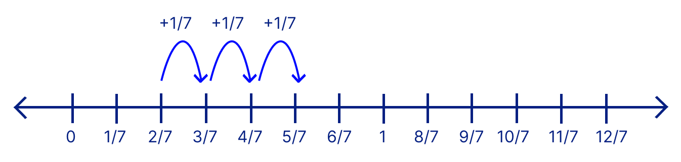 Complete the addition model by using the number line, where one section is equal to 1 / 7 .