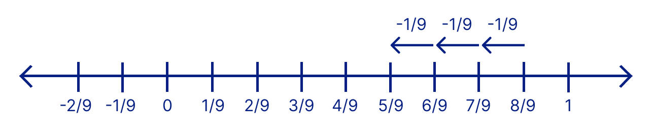 Subtract by using the number line, where line segment is divided into nine fractions.